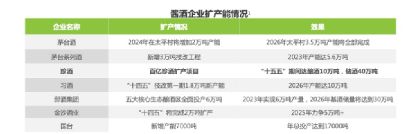 2022年上半年,茅台完成茅台酒基酒产量4.25万吨,系列酒基酒产量1.7万吨,未来茅台规划形成茅台酒5.6万吨、系列酒5.6万吨产能;习酒在2022年一期技改项目投产后,新增产能1.8万吨,达到4万吨,到“十四五”末,习酒目标产能10万吨;郎酒2022年下沙季在五大生态酿酒区全面投产6万吨酱酒,计划在2026年存酒达30万吨;珍酒在2022年下沙季酿酒投产3.5万吨,新增酿酒产能1.4万吨……酱酒一二线企业纷纷扩大产能,三四线企业也不遑多让,尽管体量不如前述一二线酒企,但在“吨位决定地位”思路的影响下,依然竭尽所能扩产。