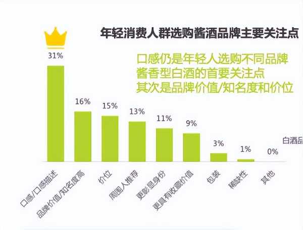 其中,口感是年轻人选购酱酒的首要关注点,比例高达31%,几乎是“品牌价值/知名度高”(16%)这一要素的两倍。