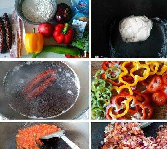 【馅料】:马苏里拉奶酪125克、香肠两段、培根两片、洋葱一个、西红柿一个、红柿子椒半个、黄柿子椒半个、青椒半个