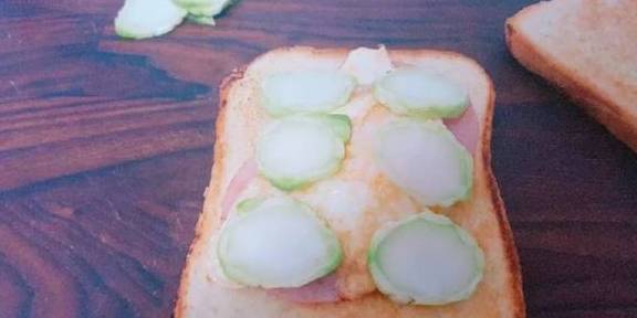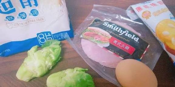 ③、把小儿菜洗干净切片儿,所有食材都放到吐司上,然后挤些炼乳和番茄酱在上面。用刀切两半儿,一会儿给它进行包装下。