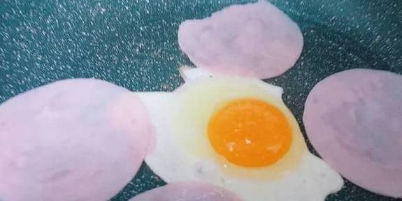 ②、往锅内加入一枚鸡蛋,撒少许盐,慢慢煎熟。把火腿也放锅里,两面都有稍微煎一煎。