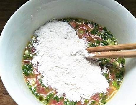 西红柿丁和葱末加入蛋液中,搅拌均匀,在加入适量面粉。
