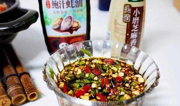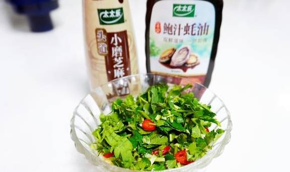 3.1勺太太乐鲍汁蚝油、适量太太乐头道小磨芝麻香油,调匀即可。