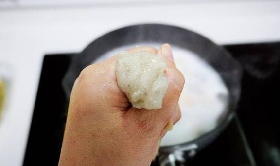 5.锅中烧水,水开后借助勺子挤入虾丸,煮熟盛出。