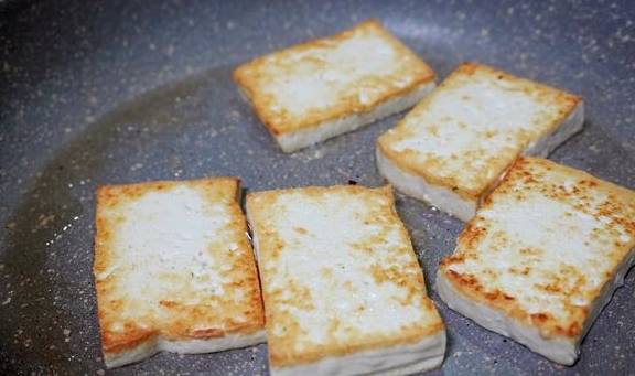 2.锅中放入适量的油烧热,放入豆腐片煎至两面金黄盛出。