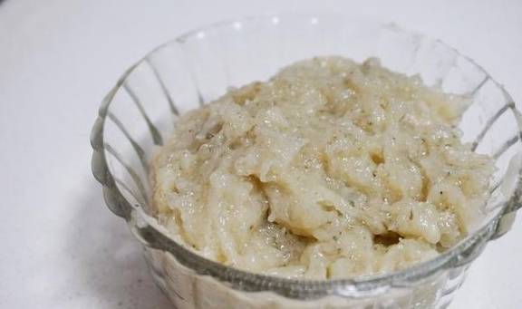 4.用筷子将虾泥朝一个方向搅拌上劲。