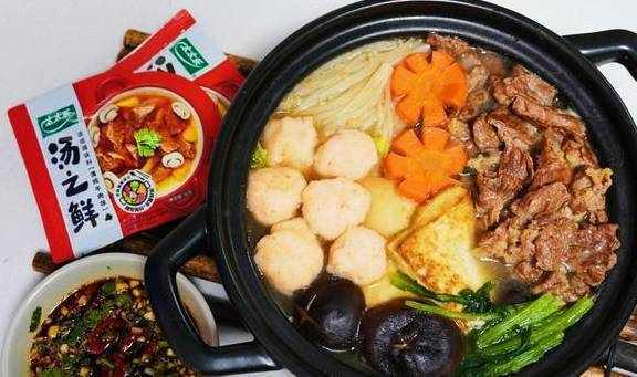 5.倒入2包汤之鲜清炖牛肉味汤底,再加入500毫升左右清水。