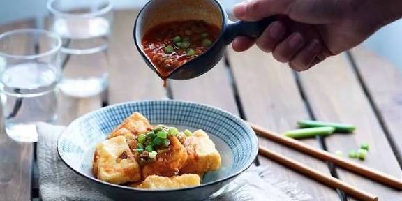 炸过的豆腐外皮酥脆,内里嫩滑。但因为内部质地太嫩,也不需要久煮才能入味,就直接把炒好的酱汁淋上去,或者拿来蘸。一小碗豆腐,能下一大碗饭。