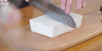 2.用凉水冲一下豆腐的包装盒,剪掉底部的四个角,倒扣,轻轻一拍
