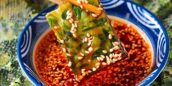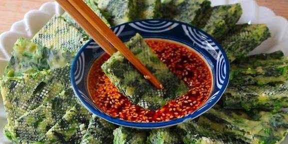 第八步:菠菜饼蒸好后取出,再切成小块,切好之后装盘,蘸上蘸料就可以开吃啦。