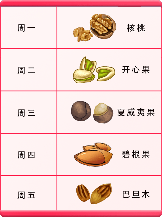 除了核桃以外,还有很多坚果对我们的人体健康有好处。如果你最近吃腻了核桃,想换换口味,可以参考下面的一周坚果指南,每天7克,就可以补充身体所需的营养!