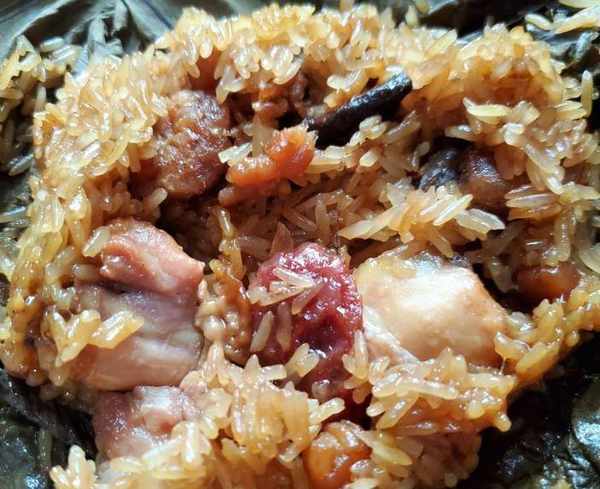 当我们把糯米和荷叶压成更好的形状时,我们可以把它们放入锅中蒸15分钟,然后当我们闻到香味时,我们就可以把糯米鸡拿出来。