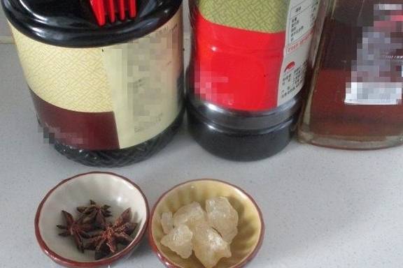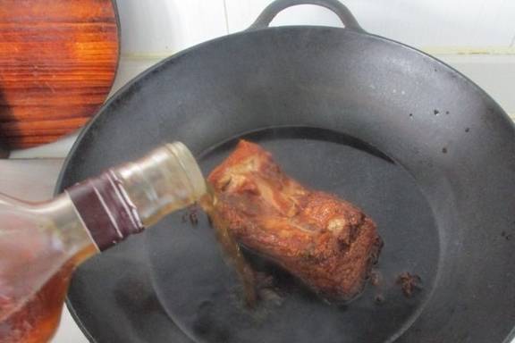 3.锅内倒入500毫升水,加入走油肉,再把生抽,老抽,八角,冰糖,黄酒倒入