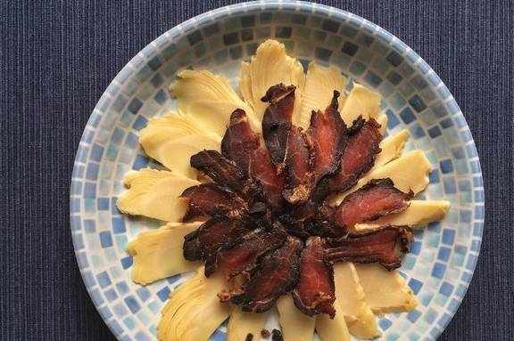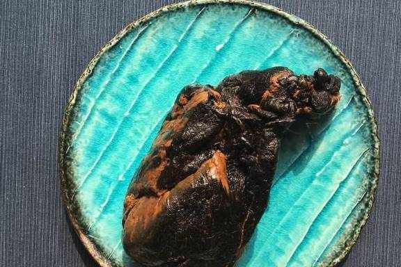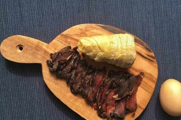 1.酱肉切薄片。刀刃一定要锋利才能切薄,还不容易伤手。第一刀切下去香气四溢,乌黑的表皮下是深红色的猪肉和白色的筋络,分外诱人。