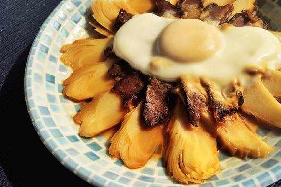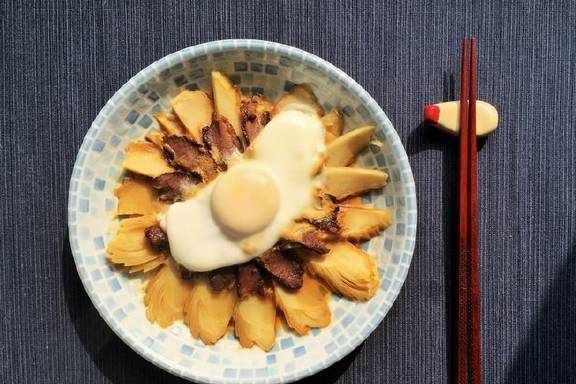 把一片酱肉、一片冬笋和一小块蛋清同时夹起,放入口中。这滋味,忍不住从鼻腔里发出满足的欢呼声呢!