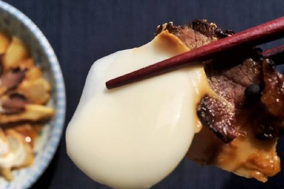 3.沿着一圈酱肉浇1大勺料酒,再捏勺白砂糖,均匀地洒在肉片上。料酒是为了去腥,白糖是为了提鲜。因为酱肉本身就很咸,这里无需再加盐。最后,记得在圆心处敲个蛋。