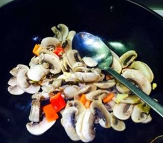 下入蘑菇,翻炒~这个时候会有点干,撒点盐把蘑菇的水分炒出来