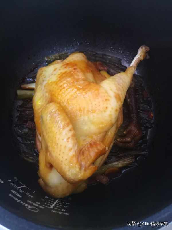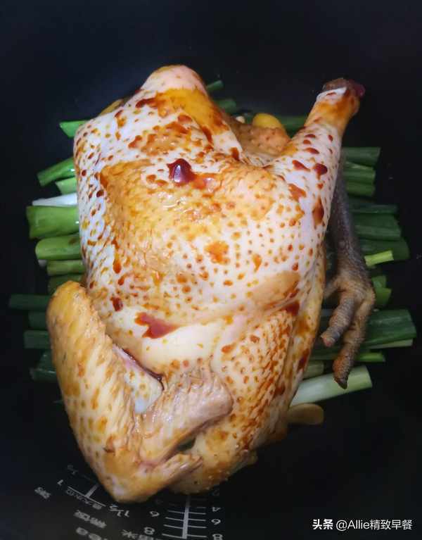 无水无油电饭锅锅底放姜片,再铺上葱花,这样既能增加风味,又能让鸡肉上色更均匀。