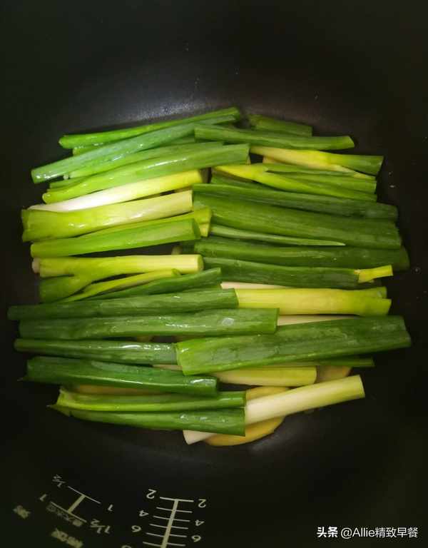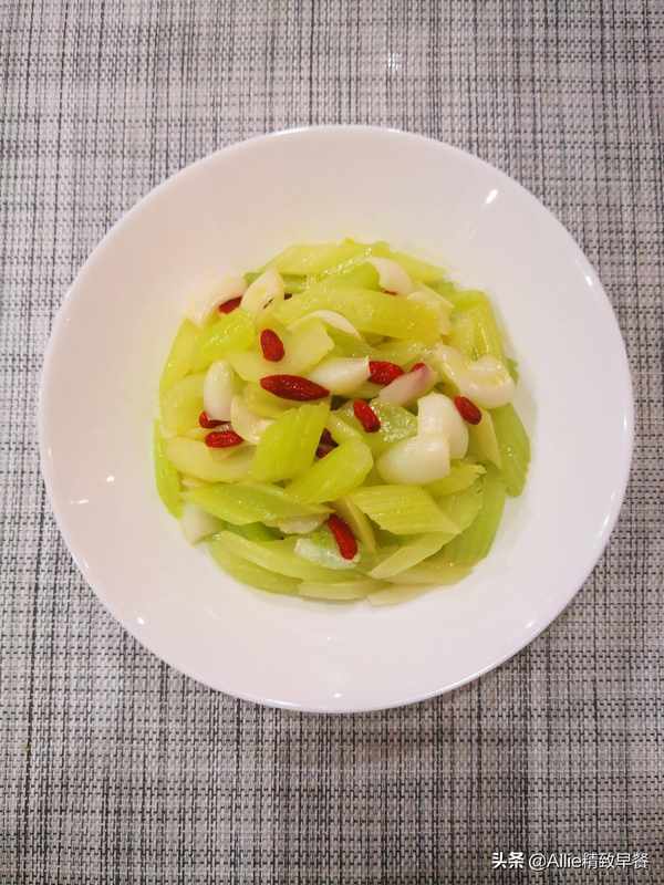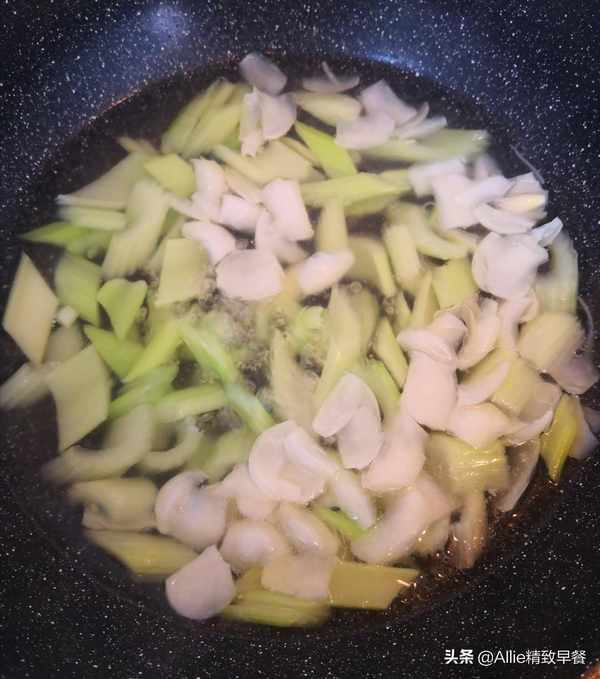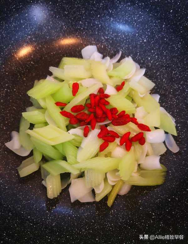 油热后,加入葱花爆香,然后加入芹菜、百合和枸杞。
