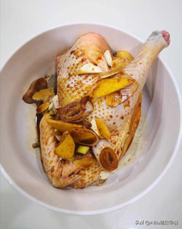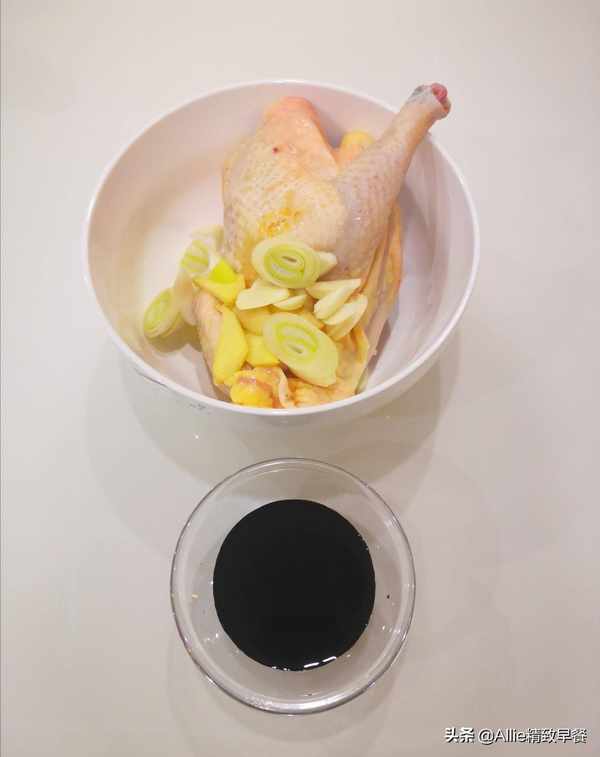 将半只鸡洗净,加入姜末、葱末和蒜末。在碗中加入适量的盐、1汤匙老抽、2汤匙生抽和少许开水将盐溶化。