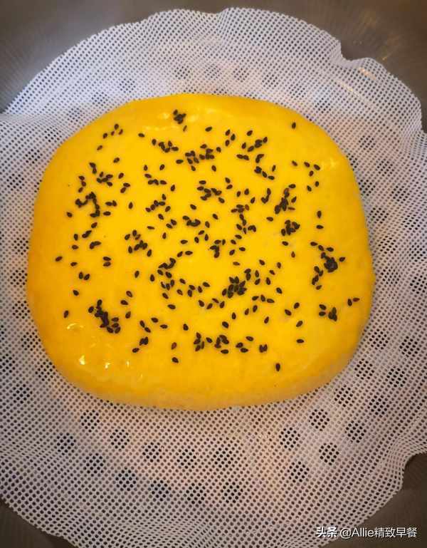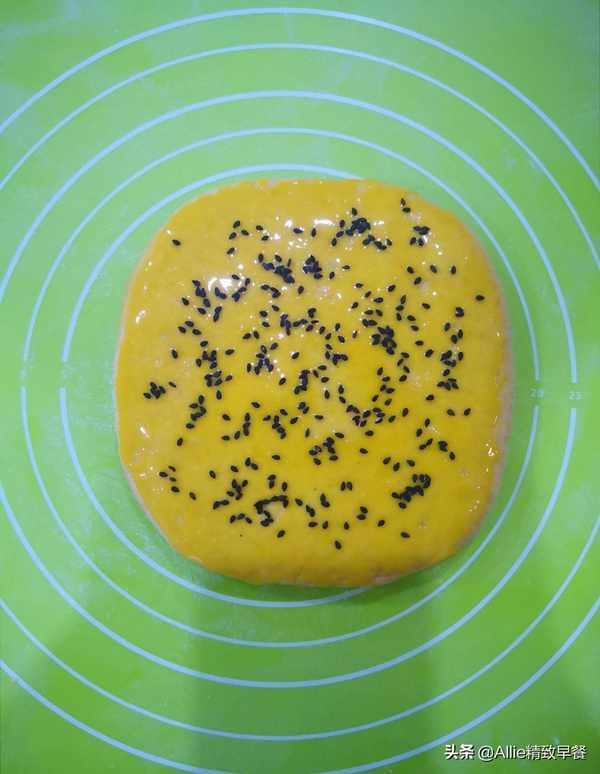 然后擀成厚约1厘米的圆胚,在饼胚表面刷上蛋黄液,再撒上熟黑芝麻,增加香气、营养和颜值。
