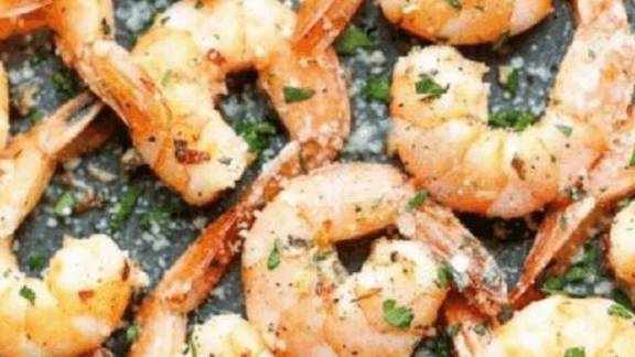 2、烤箱预热到200度,烤盘铺上一层锡纸,上面放上大虾,加入橄榄油、黑胡椒、蒜末、芝士和盐拌匀调味;