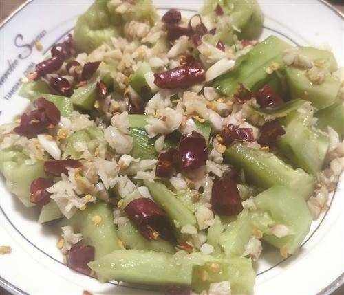 “起锅热油,放入花椒,等煸出香味后,捞出花椒不用。”准备好热油后,小姜将干辣椒段、小米椒和蒜粒放在黄瓜上,淋上热油,再撒上香菜末,一道色香味俱全、酸味扑鼻的拍黄瓜就做好了。