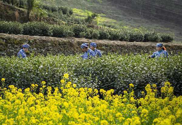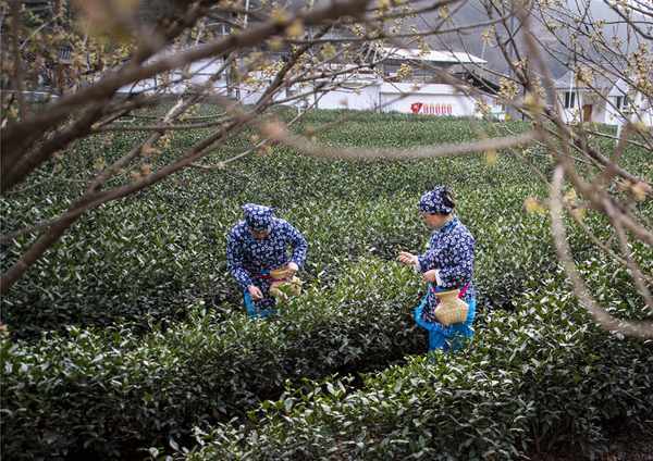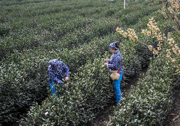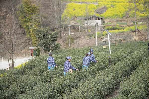 2023年2月28日,甘肃省陇南市文县范坝镇关山翠茗农民种植专业合作社300多亩茶田进入采摘期,当地茶农紧抓农时,采摘春茶、供应市场。