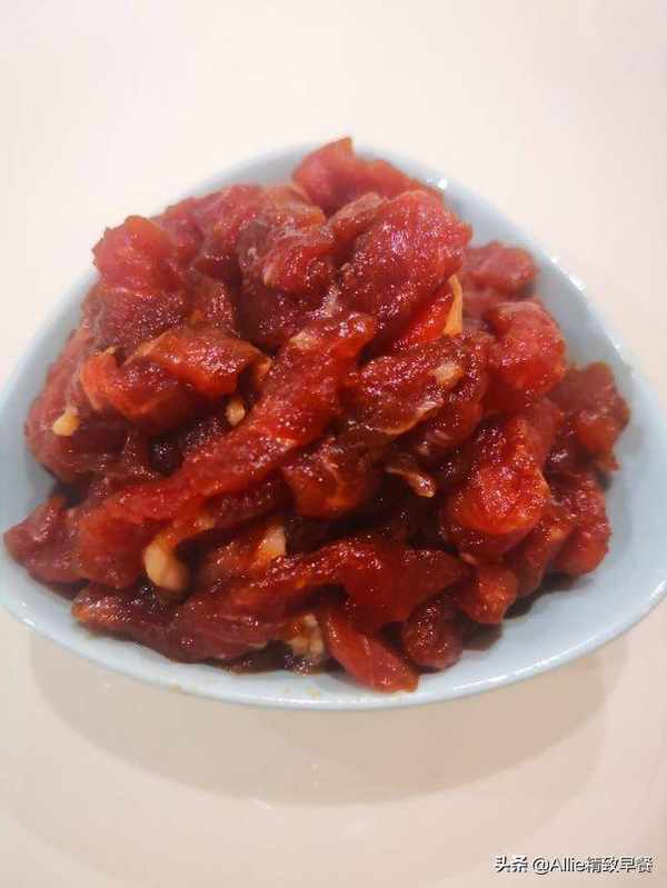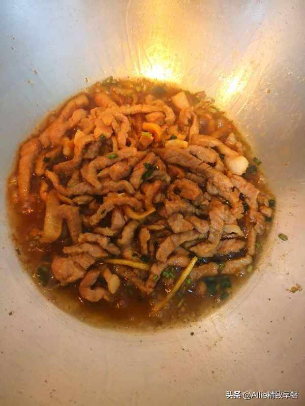 瘦肉切丝,加盐、生抽、老抽少许,拌匀腌20分钟。
