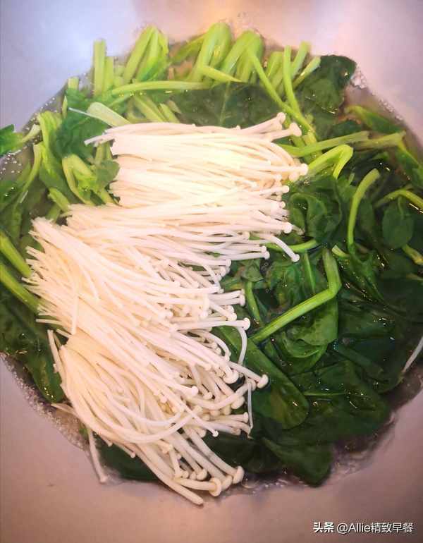 水开后放入菠菜和金针菇,加少许油和盐拌匀。