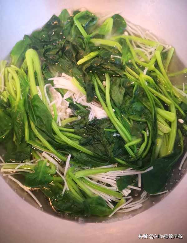 煮至金针菇和菠菜变软,大约两分钟,然后取出并检查水分。
