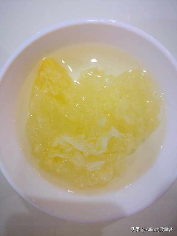 银耳用冷水泡软后洗净,切成小花。