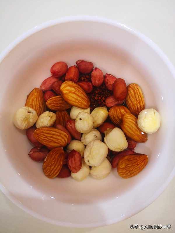 将杏仁、莲子、藜麦和花生用冷水浸泡一夜。