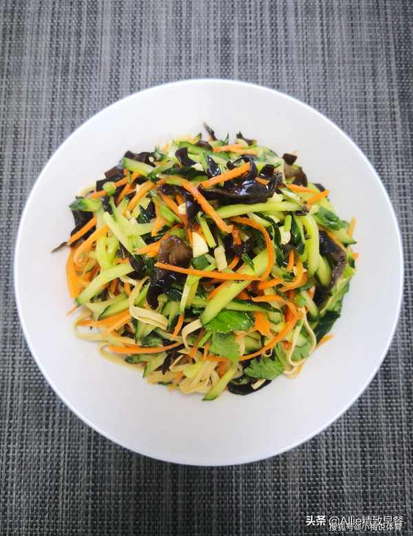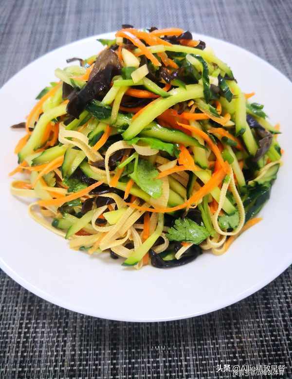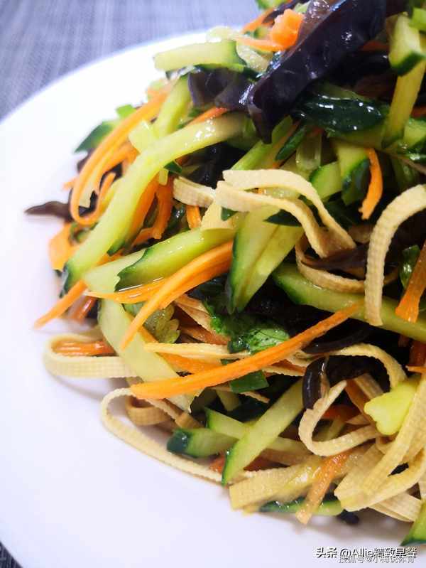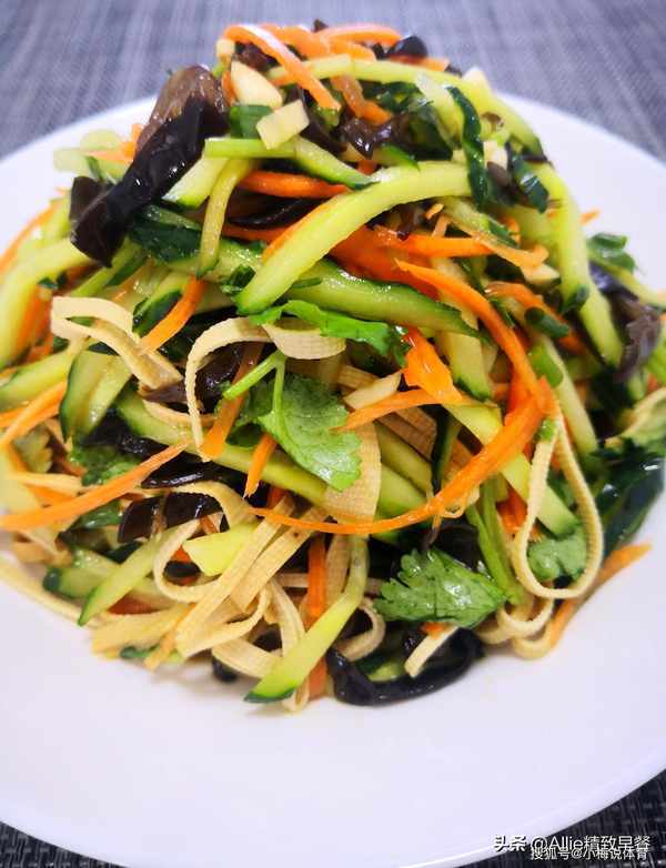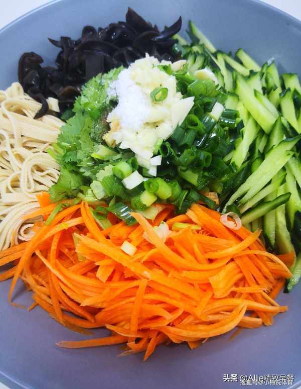 黄瓜、胡萝卜、香菇、豆腐干、洋葱、大蒜、香菜。【实践】将蘑菇浸泡并洗净。水烧开后,将豆腐干和香菇倒入水中焯一两分钟,捞出控水,然后分别切片备用。将一些黄瓜、胡萝卜切块,加入葱、香菜、大蒜、盐、生抽、陈醋、香油。