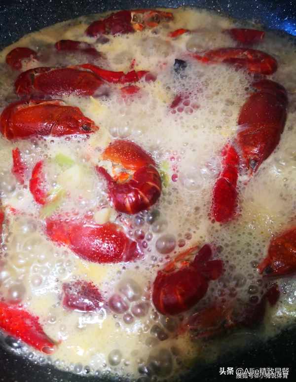 大火炒到虾变色,倒一罐啤酒在上面,大火炒到虾变色,因为龙虾在高温下会收缩,肉质更紧实,吸湿虾肉。用这种方法烹制的龙虾肉不易散开,而且更结实,更有弹性。