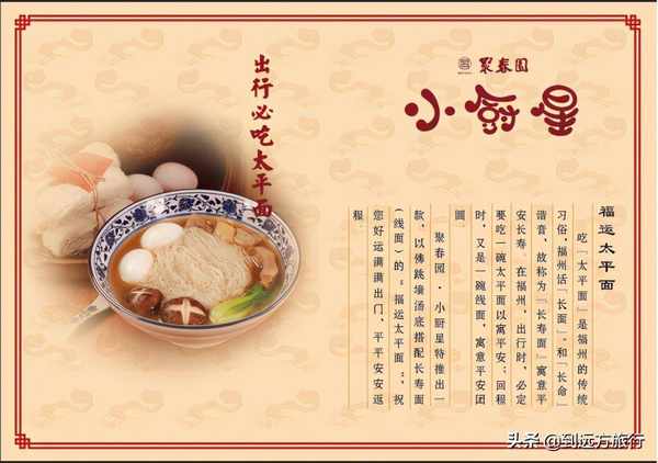 除了浓郁的地方特色,更重要的是食材本身的“厚重”内涵。传统的太平由面条、汤和两个鸭蛋组成,寓意“和平与安全”。在此基础上,福云太平还搭配了“福建菜中的极品”佛跳墙汤底,让食客享受美食。