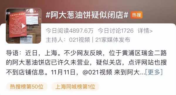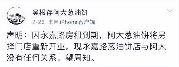阿大告诉记者,在得知这件事后,自己已于2月26日在微博上发布声明:因永嘉路房租到期,阿大葱油饼将另择门店重新开业,现永嘉路葱油饼店与阿大没有任何关系。并且,他也已找到新店的两位摊主作出警告。