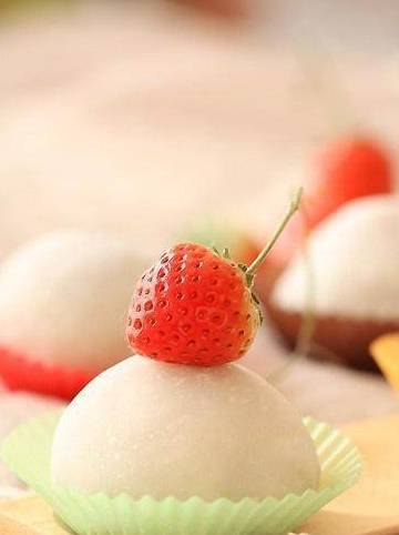 草莓大福(StrawberryDaifuku)是一种日式果子,可当茶余饭后的甜点。外层是糯米皮,里面的馅料是草莓,口感香滑软糯,有清爽的草莓果香。