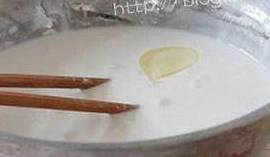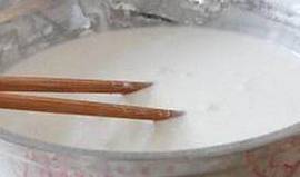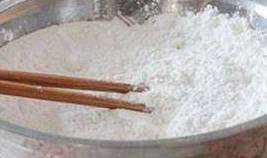 将清水绕圈方式倒入盘中,用筷子搅成米浆