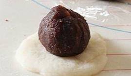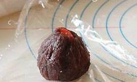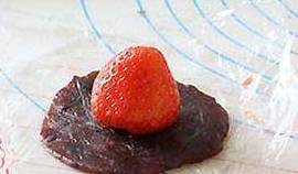 手上沾一些手粉,取一块制作好的麻糬皮压平,将豆沙草莓个头朝下摆放,捏紧麻糬皮,底部朝下即可