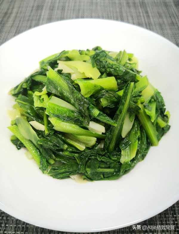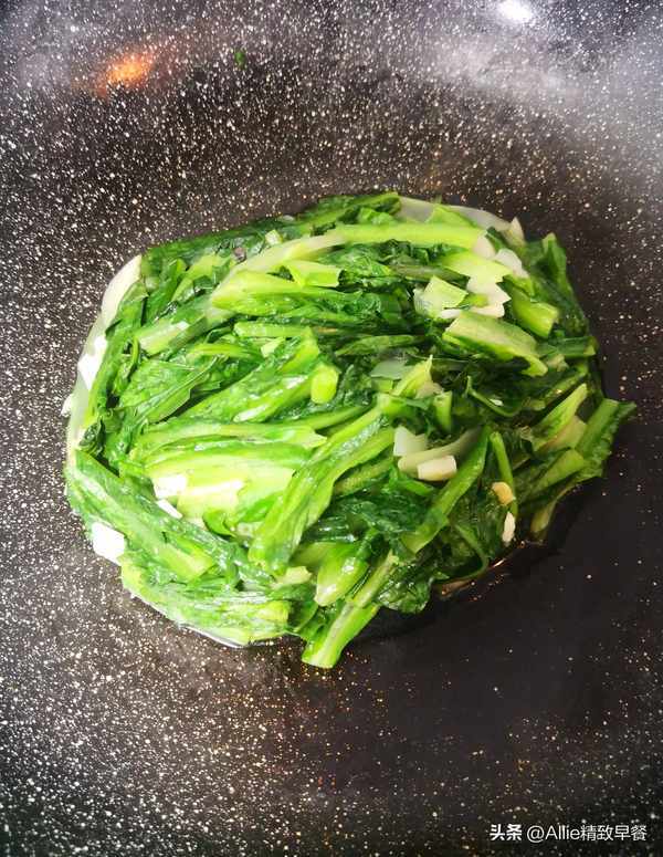 锅里加少许油,倒入洋葱和大蒜炒香,再倒入生菜,加少许盐炒至散烂,入味均匀。
