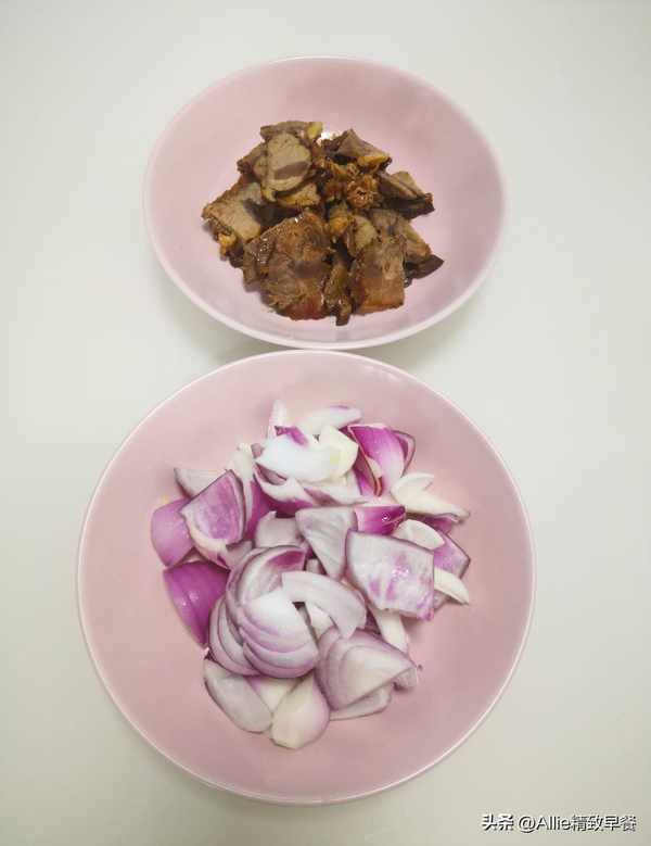 提前准备好牛里脊肉,切成薄片,洋葱适量,牛肉的烤法可以参考前几天的文章。
