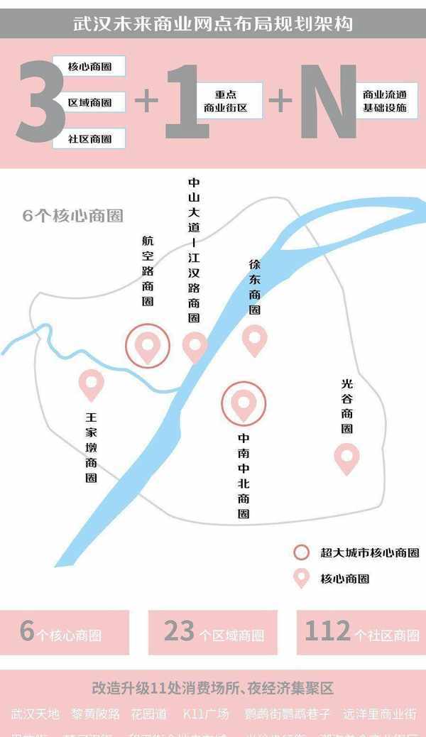 未来,武汉将形成航航路、中南中北、中山大道-江汉路、光谷、王家湾、徐东等6个主商圈、23个区域商圈和112个社区商圈。其中,航空路商圈、中南中北商圈打造为超大都市的中心商圈,俯瞰全城,辐射全国,提供国内外一流标杆。