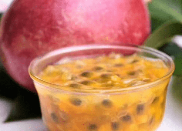 第四步:将百香果搅拌均匀。不要搅拌太久,以防止它变得局促。记得开中火搅拌,最后关火倒入一个方形碗中。(记得减半后立即关火,然后像碗一样对待它)