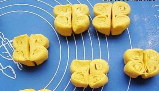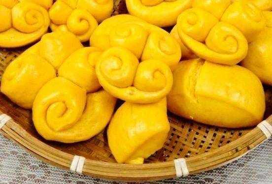 四喜馒头的外观是金黄色的,所以第一步不是纯白面粉。金黄的颜色来自于在面团中加入南瓜泥。南瓜的黄色赋予了面团自己的颜色。上面有南瓜看起来不错。香~