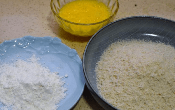 最后,将面包糠放在面包糠中并粘上面包糠,两次糊鸡蛋液和两次淀粉,更好地炸皮。