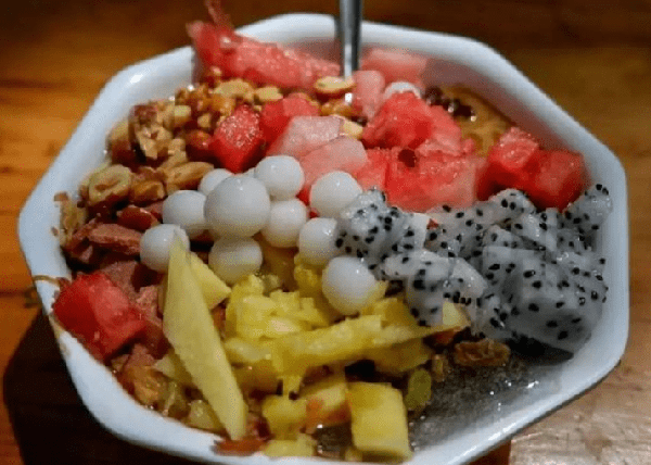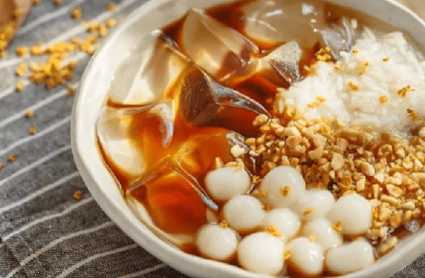 冰粉上洒上有灵魂的黑糖汁,放上红酒、小球、花生,再撒上一点干桂花装饰。冰粉的光滑度和小球的嚼劲正好吻合。它新鲜、光滑、丰富。葡萄酒的香气使单一的黑糖汁更有层次感。你吃的每一口都充满了心,它可以驱走你所有的热量。