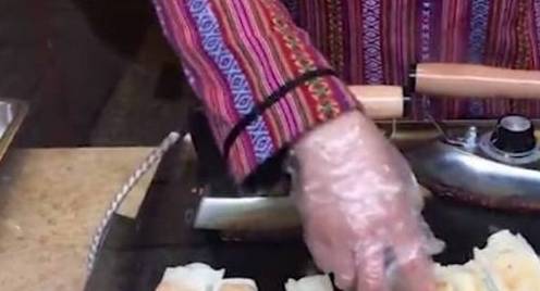 问了老板才知道,老板今年47岁,在这里卖这特别小吃已经2年了,大姐说,这小吃有点像春卷,和春卷一样是用薄薄的卷皮卷上各种馅料,大家都知道春卷是用油炸,有比较多,因为现在不吃油炸油腻东西的人很多,所以老板想了这种方法来把春卷熨烫熟!