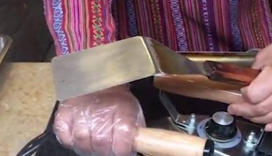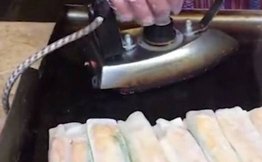 只见大姐把包好的大号春卷放在铁板上,然后用两个大熨斗在上面熨压,不停的翻转不停的熨,因为在制作的时候里面没有加入油,所以表面看起来没有炸春卷那么金黄,熨烫好的春卷小编尝了下确实不油腻,吃着很健康,外面的皮香,里面的馅料鲜美,很好吃,尝过后小编买了30个!不知道这样的罕见小吃你吃过吗?47岁大姐街边用“电熨斗”做小吃!我是第一次见!一下买了30个!