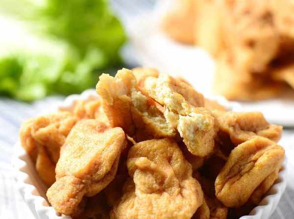 4、炸面筋:将面筋切成条状,在油锅中炸至金黄色,口感酥脆,外焦里嫩。可以配上甜酱、辣酱等调料,更加美味可口。